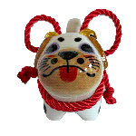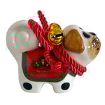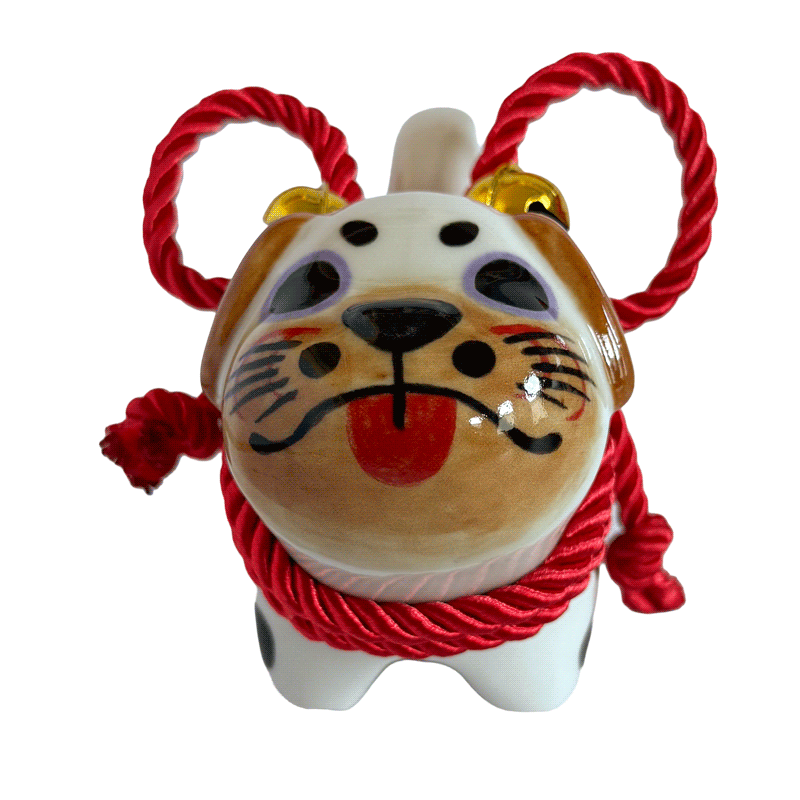 Inspired by the traditional Inu Hariko, a beloved Japanese papier-mâché dog, this ceramic piece features a unique pug design. The figurine is adorned with a rope tied in a simple bow and small bells.