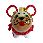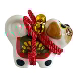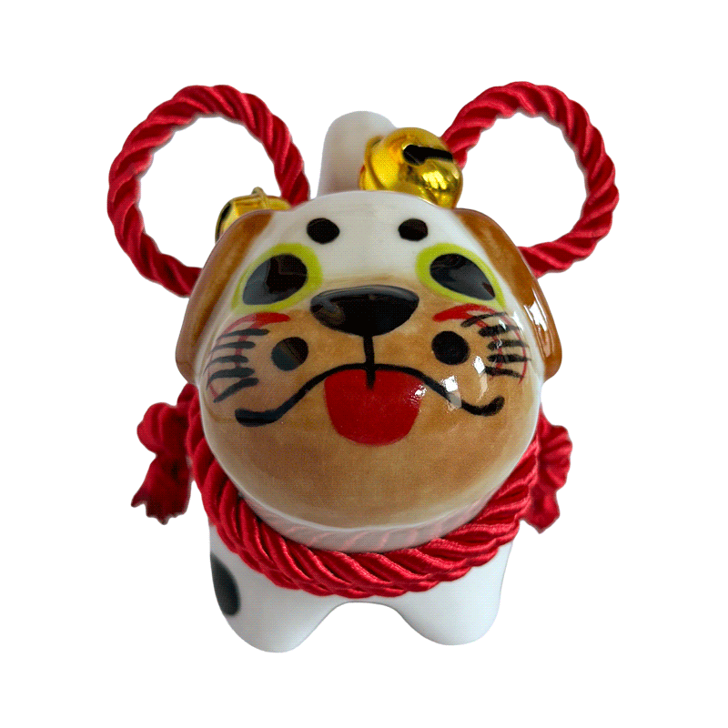 Inspired by the traditional Inu Hariko, a beloved Japanese papier-mâché dog, this ceramic piece features a unique pug design. The figurine is adorned with a rope tied in a simple bow and small bells.
