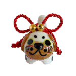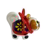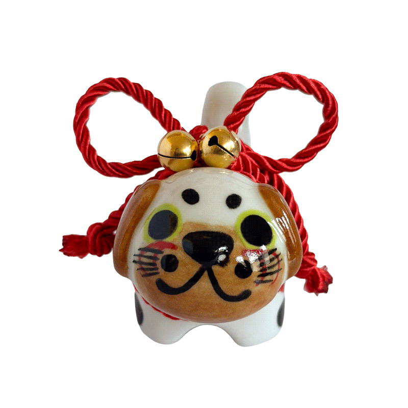 Inspired by the traditional Inu Hariko, a beloved Japanese papier-mâché dog, this ceramic piece features a unique pug design. The figurine is adorned with a rope tied in a simple bow and small bells.