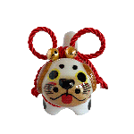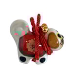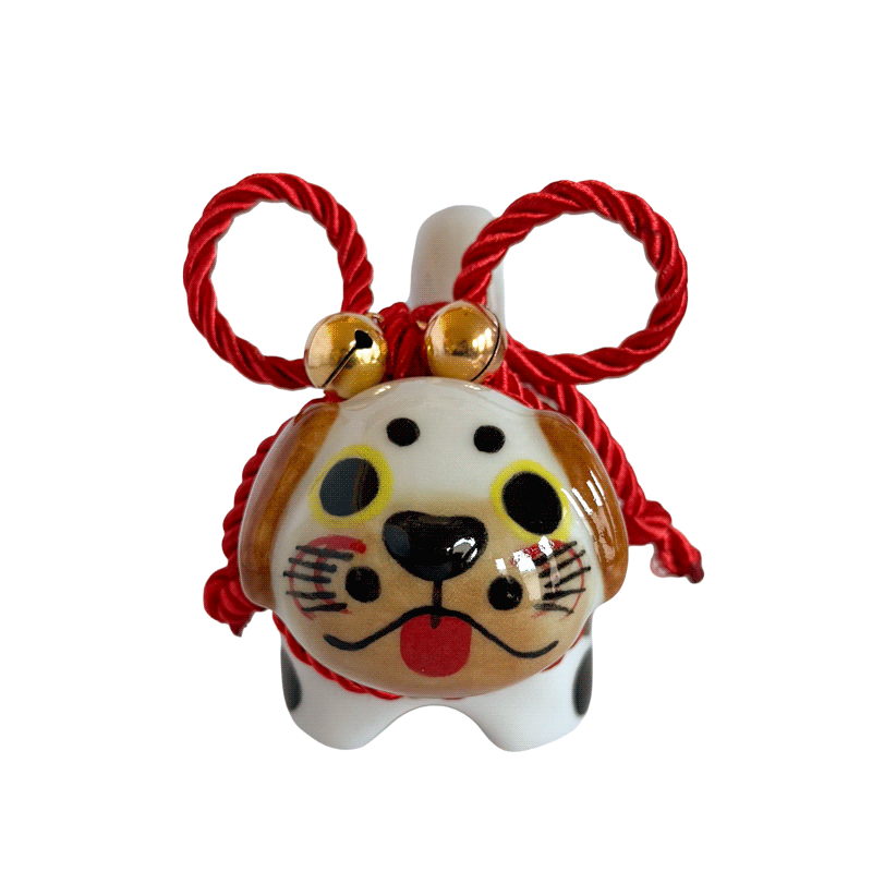 Inspired by the traditional Inu Hariko, a beloved Japanese papier-mâché dog, this ceramic piece features a unique pug design. The figurine is adorned with a rope tied in a simple bow and small bells.