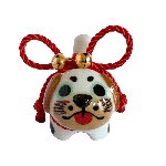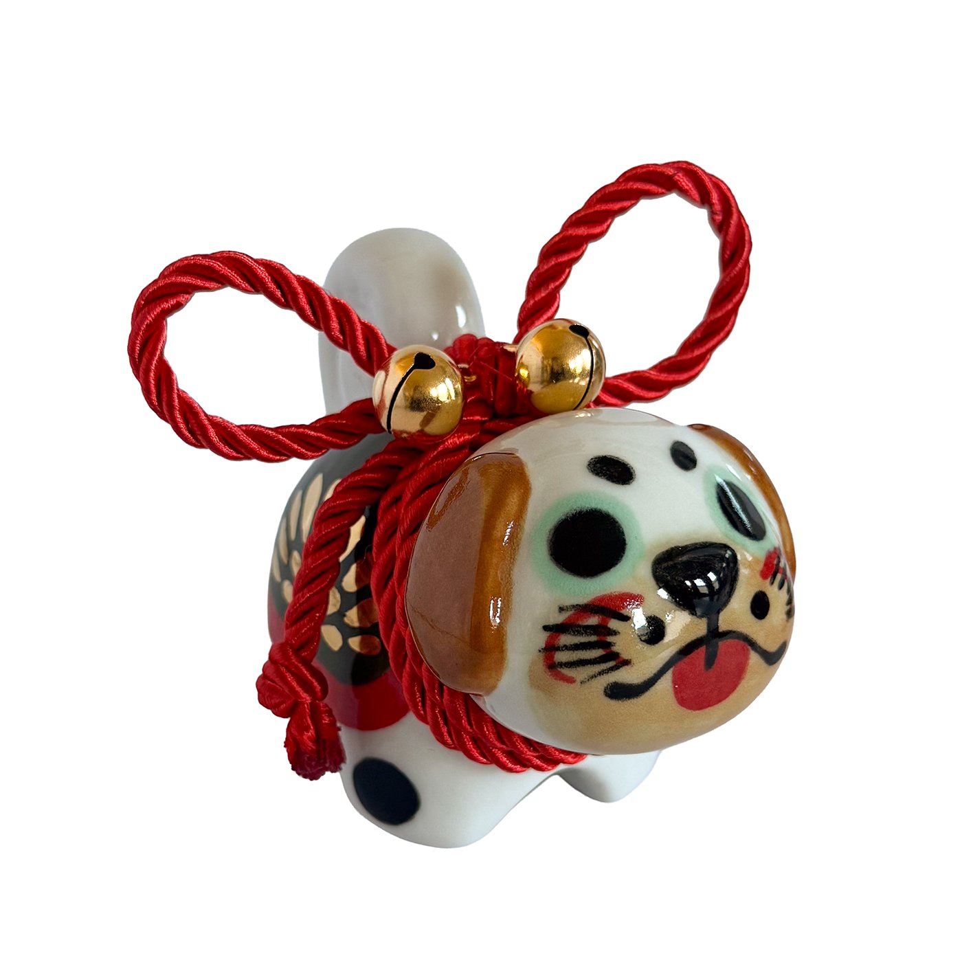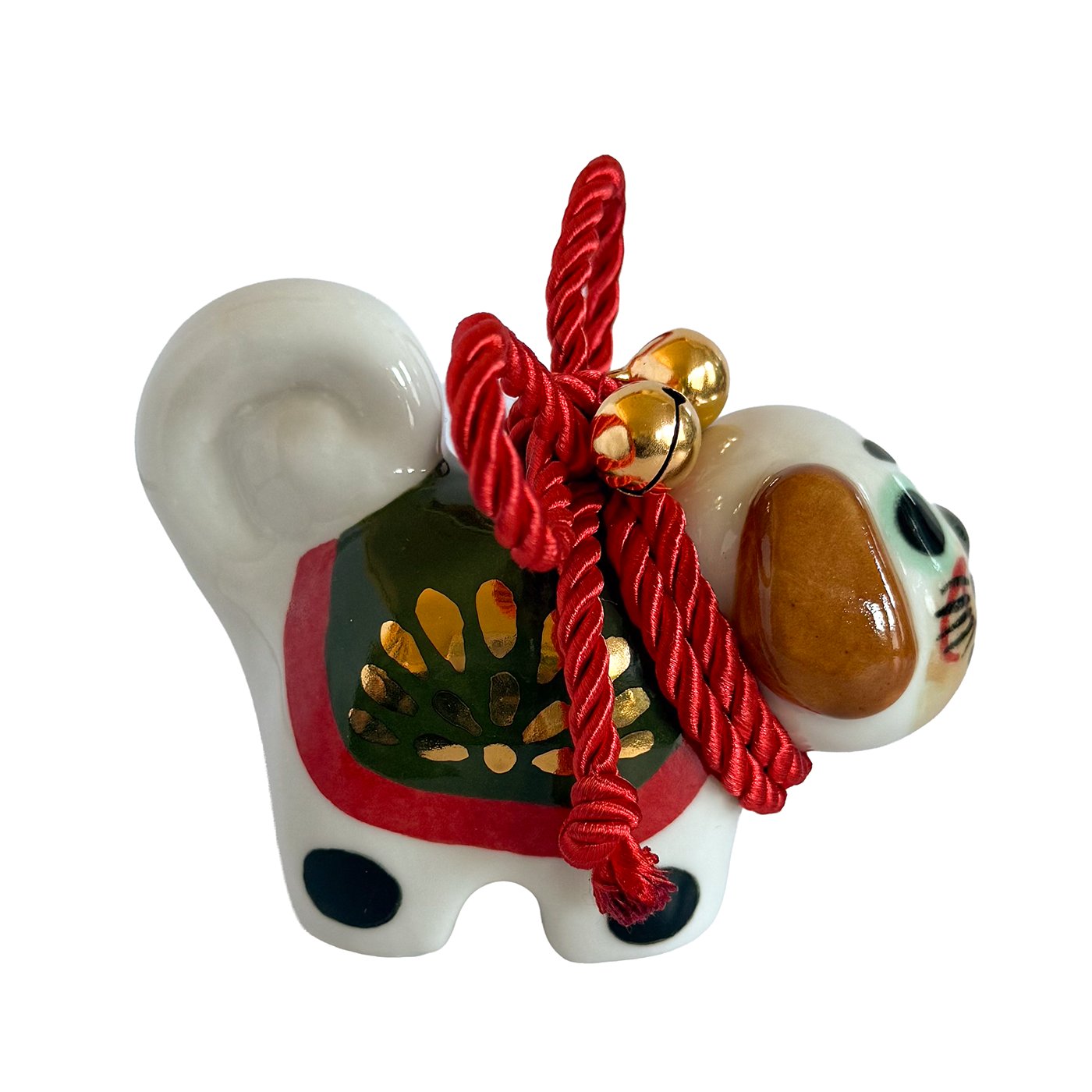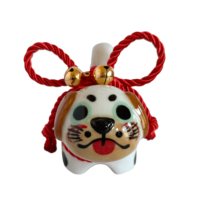 Inspired by the traditional Inu Hariko, a beloved Japanese papier-mâché dog, this ceramic piece features a unique pug design. The figurine is adorned with a rope tied in a simple bow and small bells.