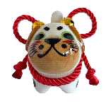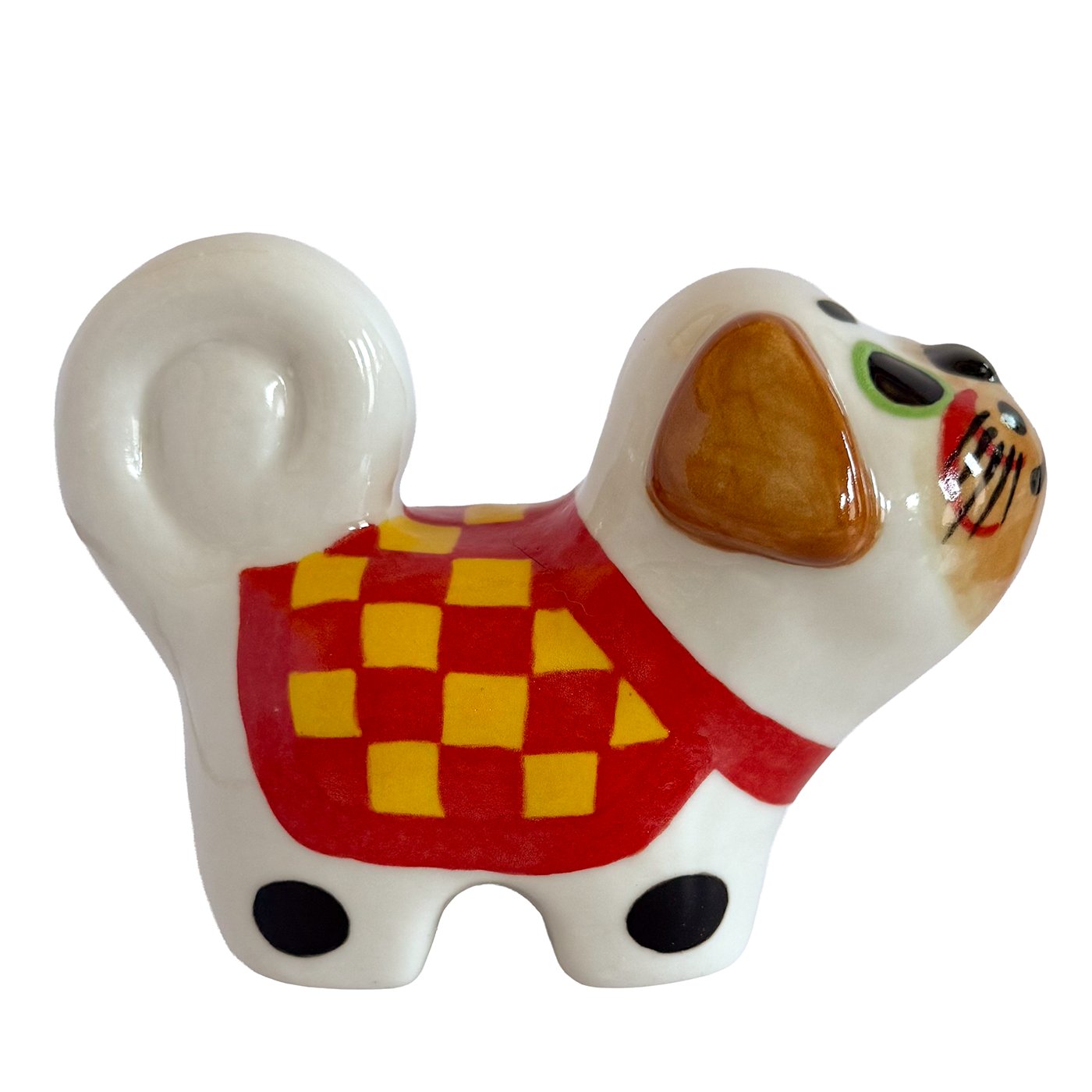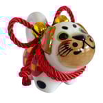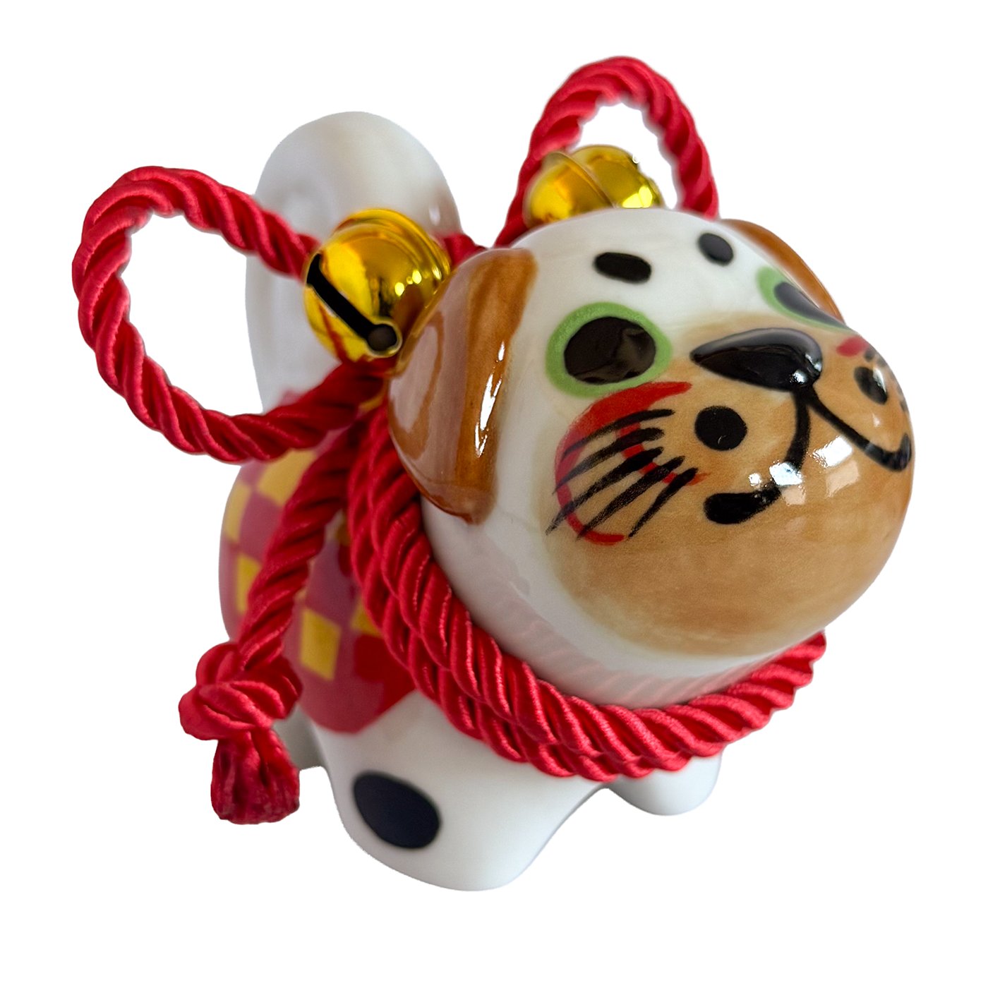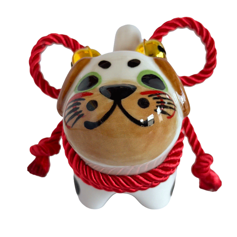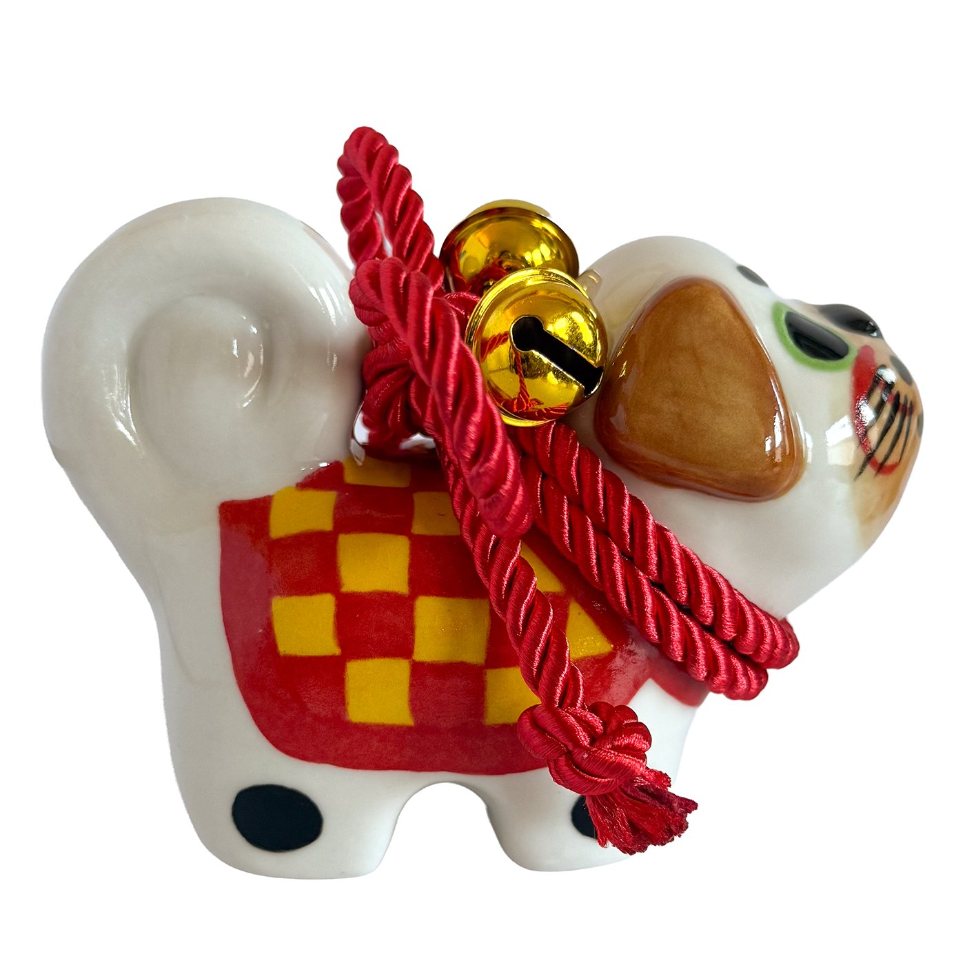 Inspired by the traditional Inu Hariko, a beloved Japanese papier-mâché dog, this ceramic piece features a unique pug design. The figurine is adorned with a rope tied in a simple bow and small bells.