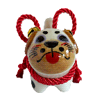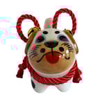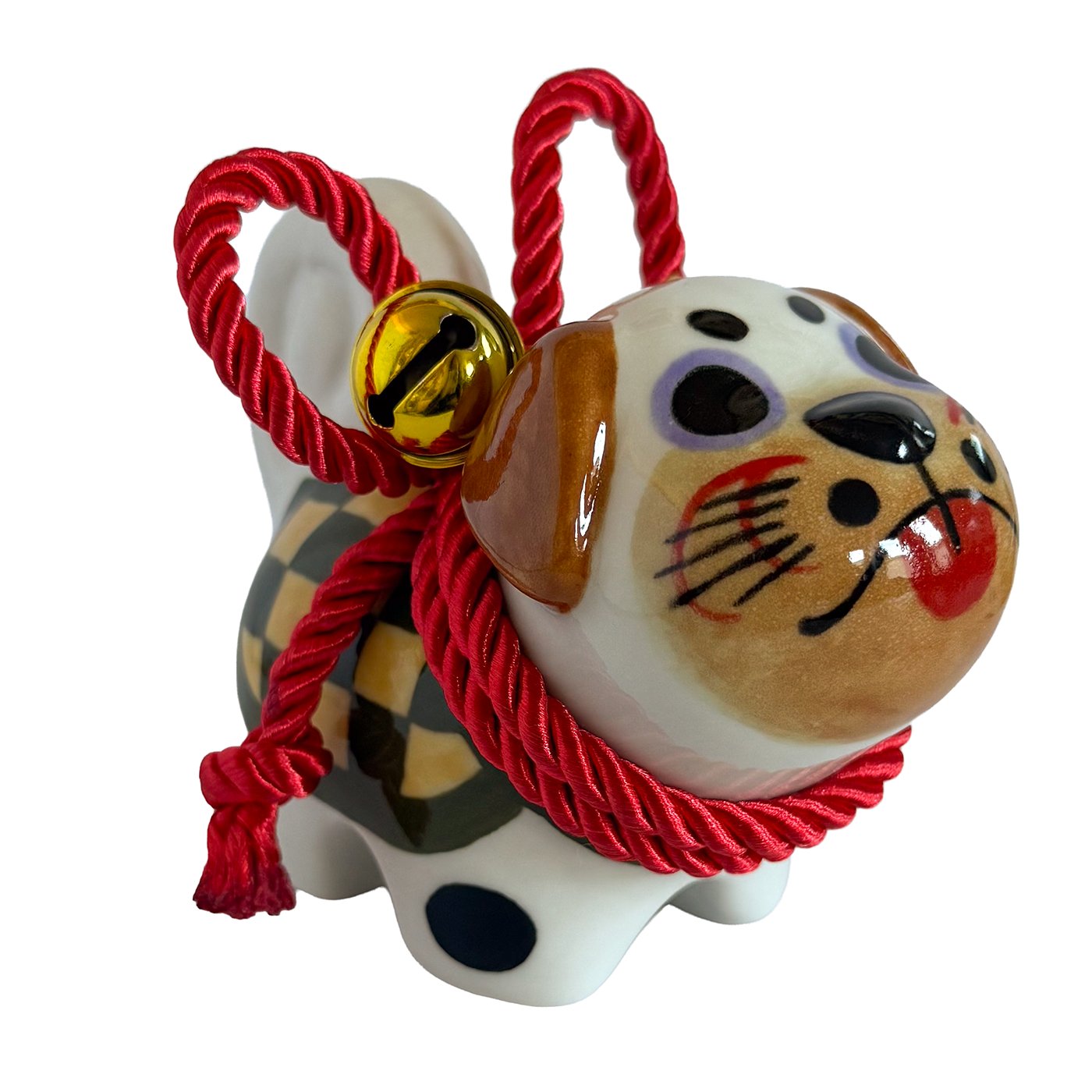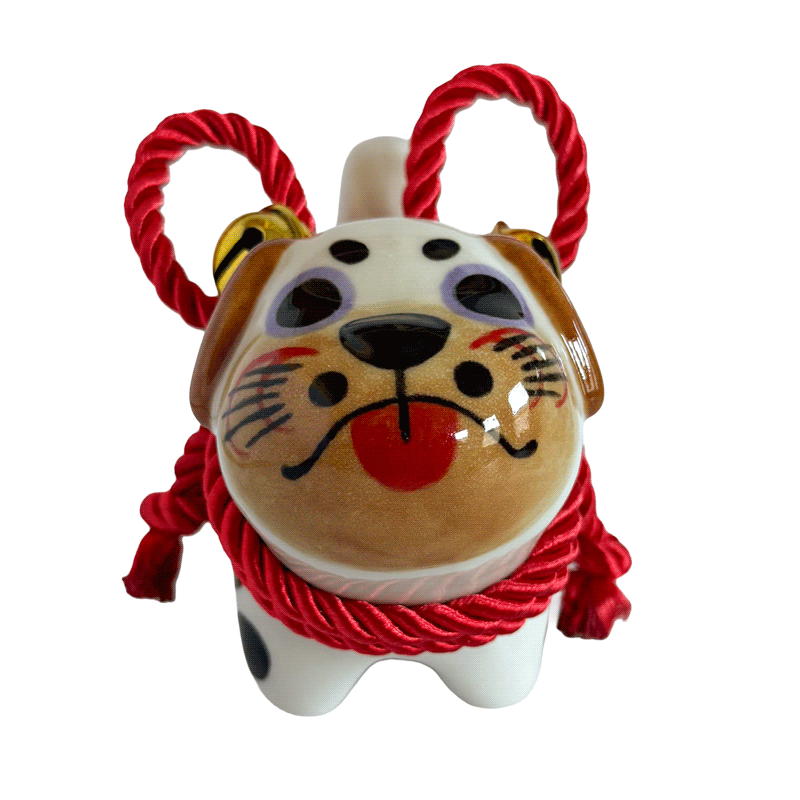 Inspired by the traditional Inu Hariko, a beloved Japanese papier-mâché dog, this ceramic piece features a unique pug design. The figurine is adorned with a rope tied in a simple bow and small bells.